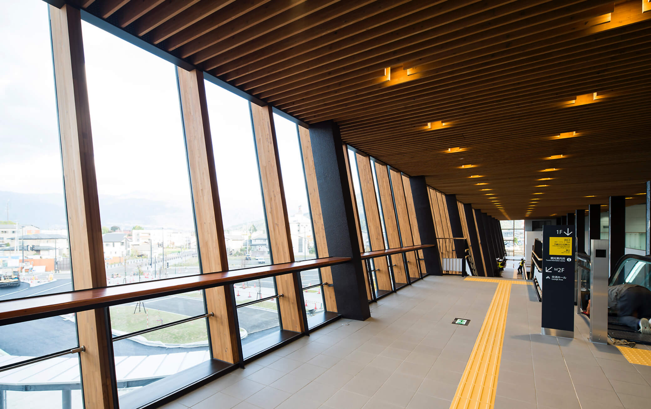 外観デザインは雪化粧をした雄大な山並みと伝統工芸「内山和紙」の柔らかさを感じさせるものとし、駅に併設される都市施設は街並みの特徴である雁木をモチーフとしたアトリウム空間で、広場に迫り出すように傾いたカーテンウォールが駅を印象付けている。アトリウム空間の光柱は千曲川の四季を表し、駅にささやかな象徴性をあたえている。北陸新幹線屈指の豪雪地帯であるため、雪対策にも配慮している。