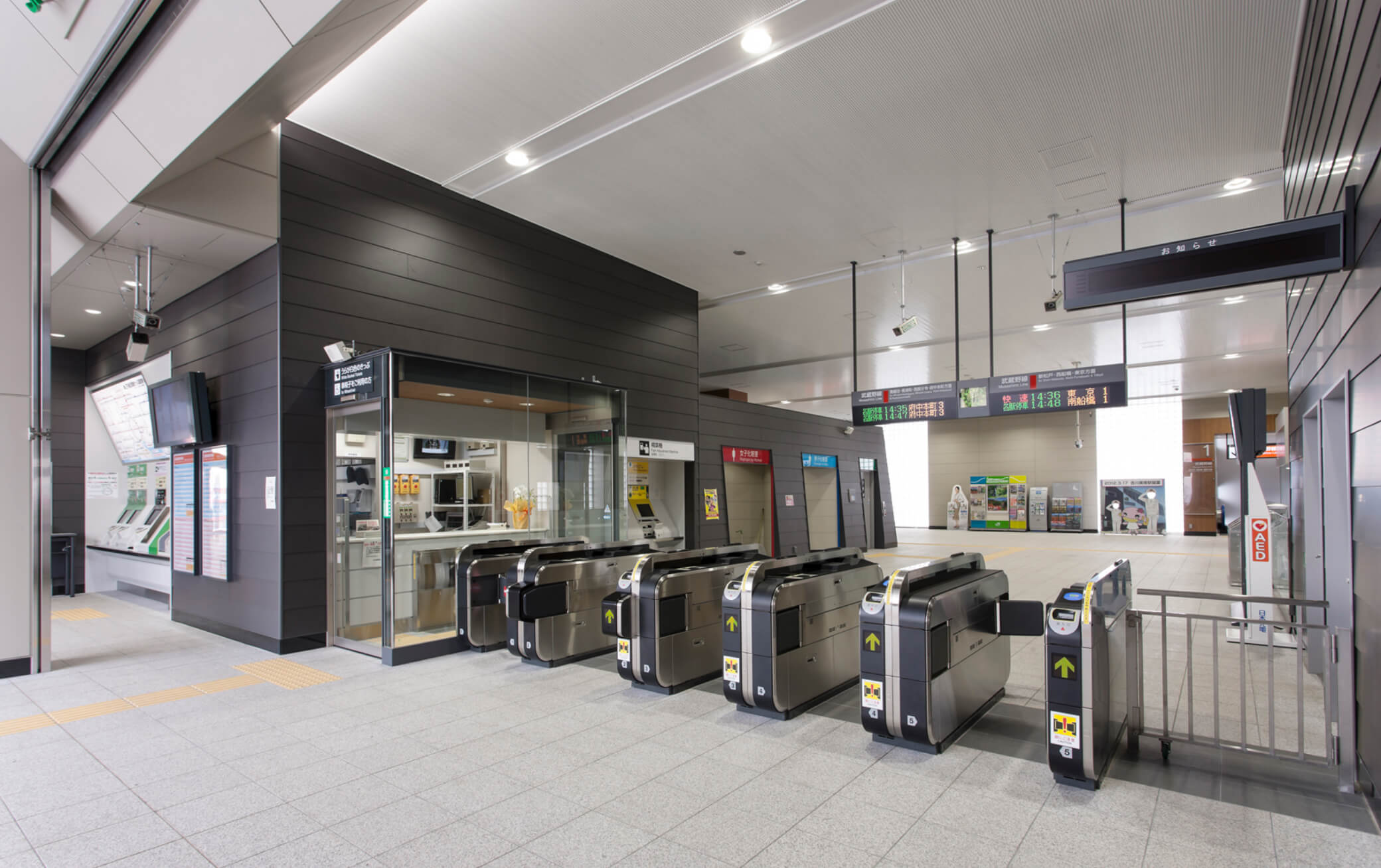 武蔵野線吉川駅・新三郷駅間に開業した新駅。「自然と人と共に生きる駅」をコンセプトとし、ファサードデザインには木の葉の形状をモチーフとしたサッシを使っている。内部は純粋な駅機能からなるシンプルな空間構成であるが、ラチ内コンコースの天井高さは5m、トイレは3.1mかつ壁面の傾斜など、ボリュームの操作により開放的な空間を演出している。内装材は耐久性を持った顔料練込硬質セメント板を選定し、落下防止の仕様でラップ工法とする事で陰影を出し、表情豊かな壁面をしている。