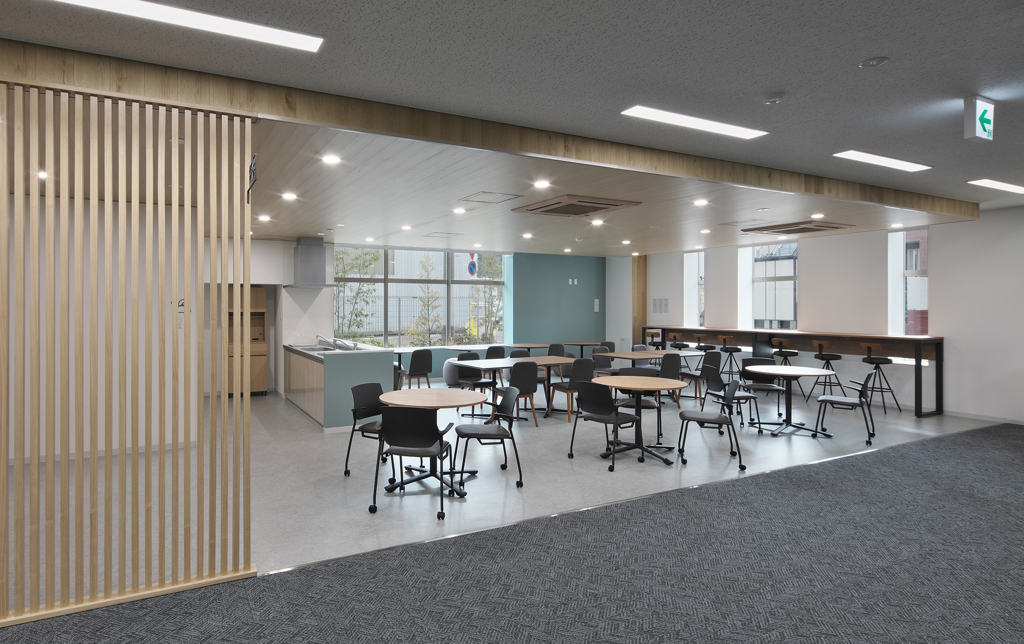 働き方改革の一環で、職場環境の整備を進めているJR東日本。武蔵野運輸区事務所の新設もその一つで、誰もが気兼ねなく安心して自らの意欲を伸ばしていく、職場風土の実現を目指している。武蔵野運輸区事務所の大きな特徴は、閑静な住宅街の一画に計画されたこと。まちの人々と緊密な関係を築く必要がある鉄道会社の事務所は、地域の方々に愛される建物でなくてはならないという思いから、周辺の環境との調和を重視して計画した。地域動線に面した緑地には、植物を植えて、周辺の方々にも楽しんでいただいている。